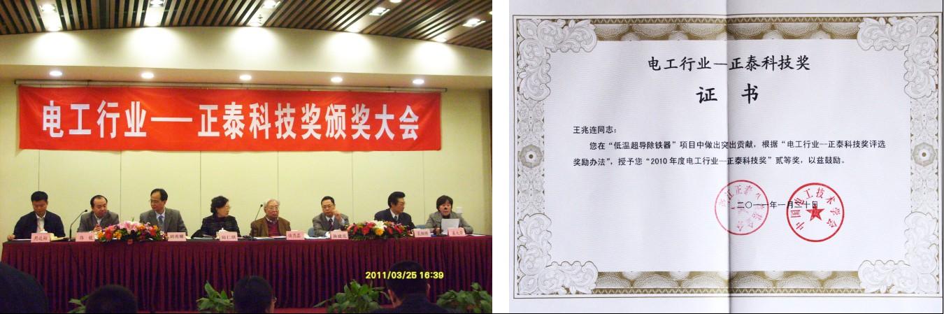 2011年3月25日,2010年度“電工行業(yè)——正泰科技獎”頒獎大會在北京中國科技會堂舉行。我公司董事長、總經(jīng)理王兆連以其率領(lǐng)團隊在研發(fā)超導(dǎo)除鐵器上的貢獻獲此殊榮。