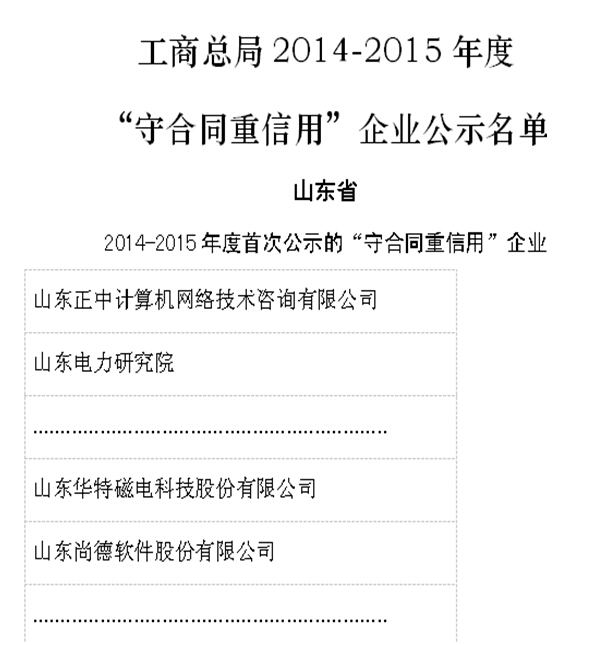 山東華特列入工商總局2014-2015年度“守合同重信用”企業(yè)