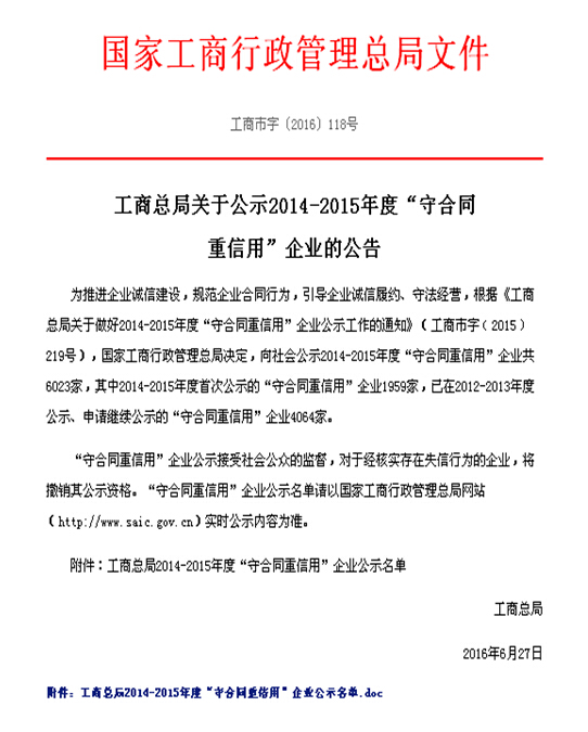 近日國家工商行政管理總局以工商市字(2016)118號發(fā)布了工商總局關(guān)于公司2014-2015年度“守合同重信用”企業(yè)的公告,華特公司名列其中。近年來華特公司積極推進(jìn)誠信建設(shè),嚴(yán)格規(guī)范合同行為,誠信履約、守法經(jīng)營,得到了上級主管部門和客戶的一致好評,一直是山東省“守合同重信用”企業(yè),本次列入國家級“守合同重信用”企業(yè)是對公司規(guī)范化管理的肯定,將進(jìn)一步推動企業(yè)的快速發(fā)展,促進(jìn)企業(yè)向國際領(lǐng)先的磁力應(yīng)用系統(tǒng)服務(wù)商邁進(jìn)。
