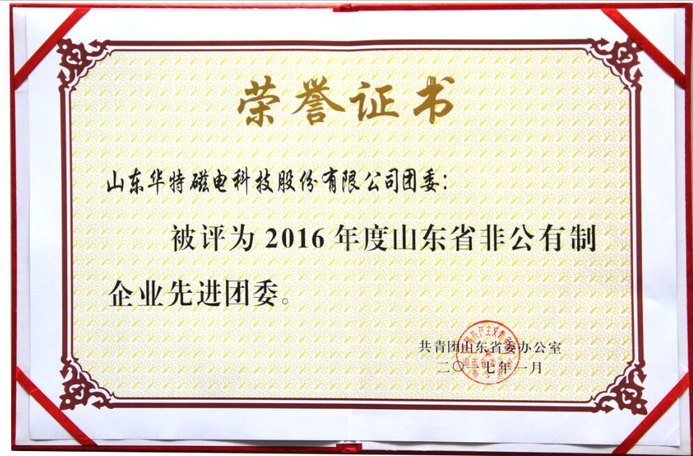 近日,山東華特磁電科技股份有限公司團委被團省委授予“2016年度山東省非公有制企業先進團委”榮譽稱號,公司團委連續兩年獲此殊榮。