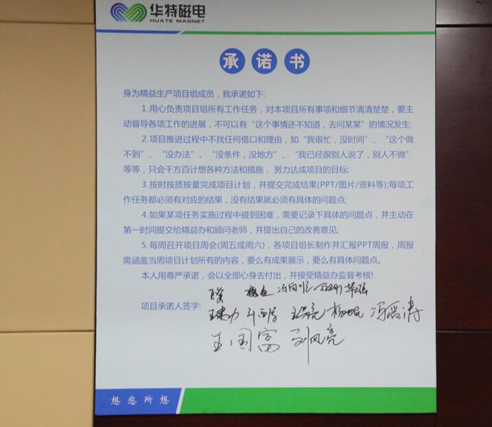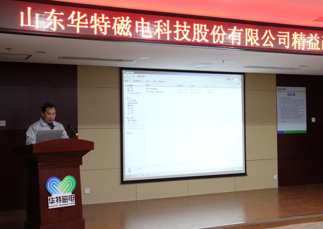2018年1月14日,為進一步提升山東華特磁電科技股份有限公司管理水平,增強公司競爭力,實現(xiàn)企業(yè)高速發(fā)展,公司組織召開了精益生產(chǎn)二期項目的簽約、啟動儀式和誓師大會。公司董事長兼總裁王兆連、山東華制智能制造技術(shù)有限公司項目總監(jiān)王樹功、項目經(jīng)理王金泉等四位專家出席會議,公司常務(wù)副總裁劉風(fēng)亮、高級副總裁劉梅、副總裁兼精益辦主任王建波、各部門負(fù)責(zé)人以及主管級以上領(lǐng)導(dǎo)參加會議。