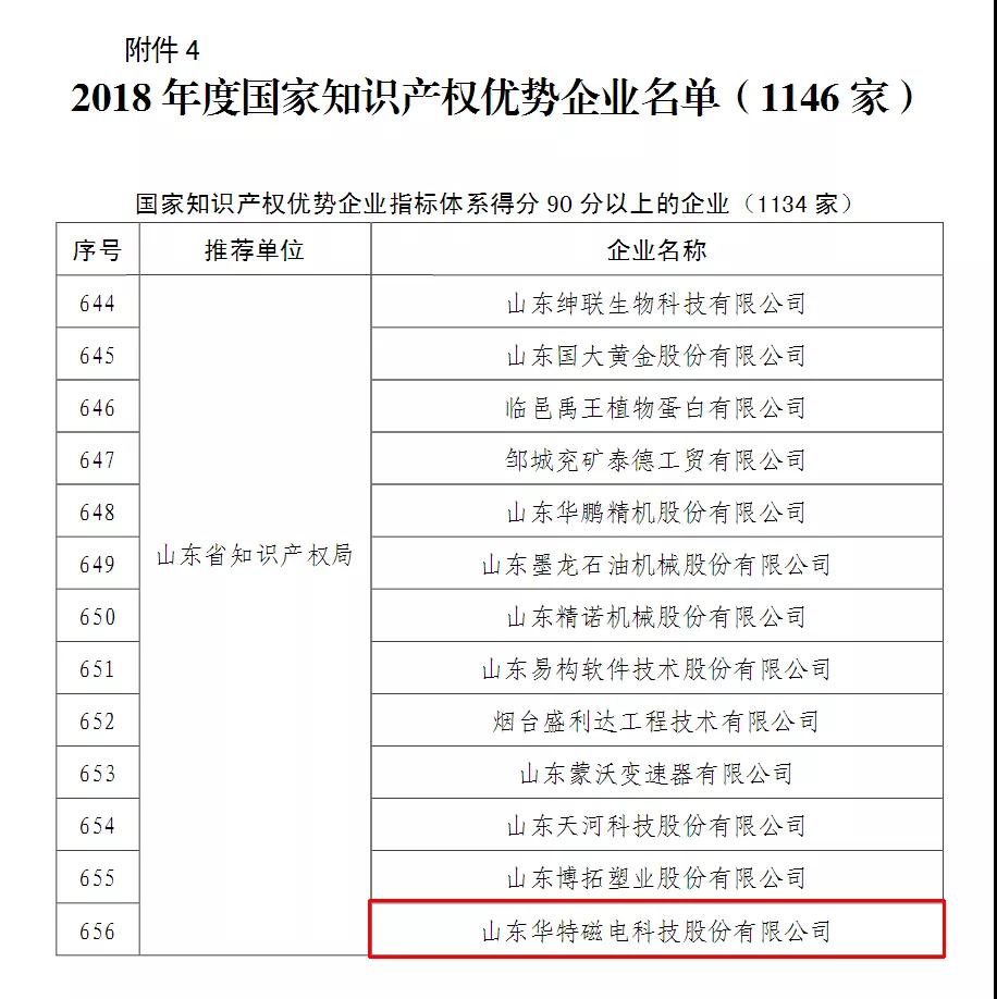 根據(jù)“國知發(fā)管函字〔2018〕158號(hào)”文件,經(jīng)企業(yè)申報(bào),各省、自治區(qū)、直轄市推薦,國家知識(shí)產(chǎn)權(quán)局審核,并經(jīng)社會(huì)公示,確定山東華特磁電科技股份有限公司等1146 家企業(yè)為2018年度國家知識(shí)產(chǎn)權(quán)優(yōu)勢(shì)企業(yè),新一輪或新確定國家知識(shí)產(chǎn)權(quán)示范企業(yè)、優(yōu)勢(shì)企業(yè)建設(shè)工作期限自2018 年8月至2021年7月。