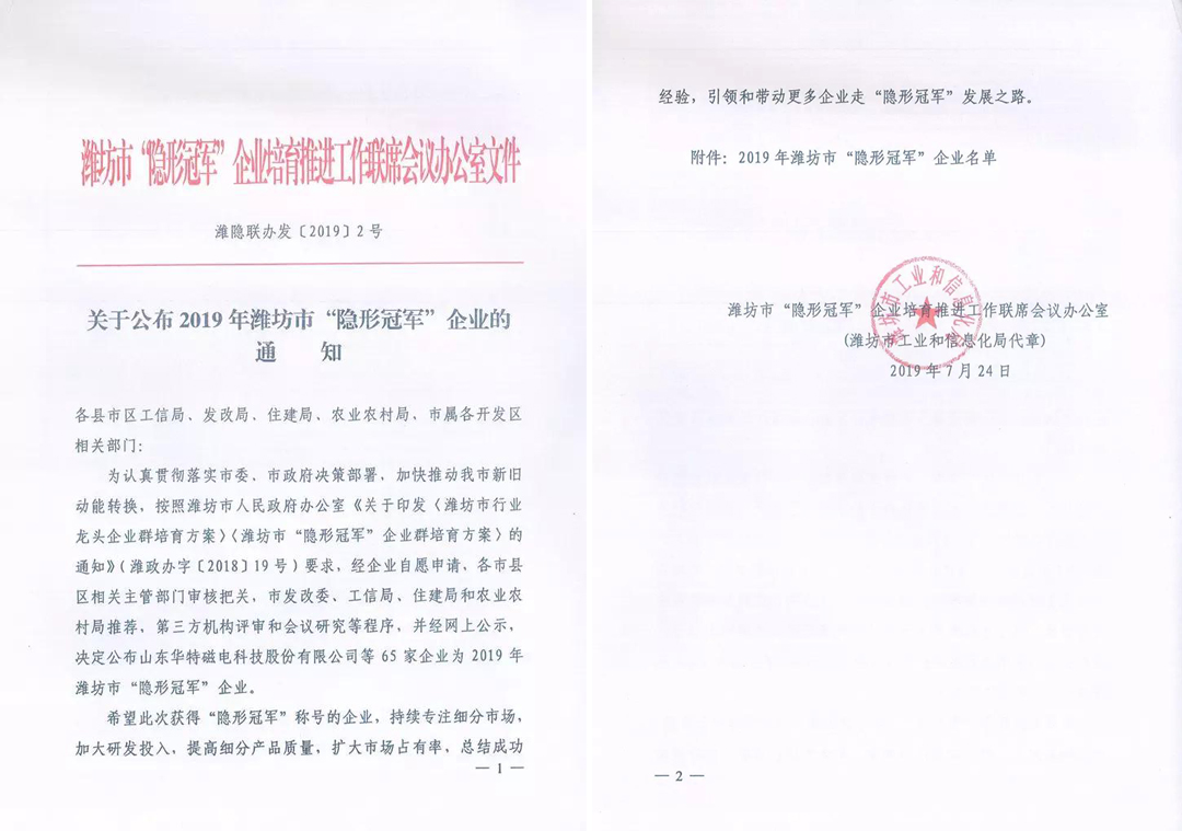 【喜訊】 山東華特磁電被認定為2019年度濰坊市隱形冠軍企業