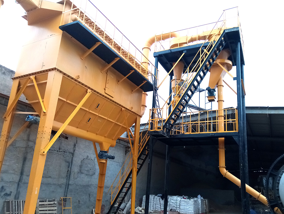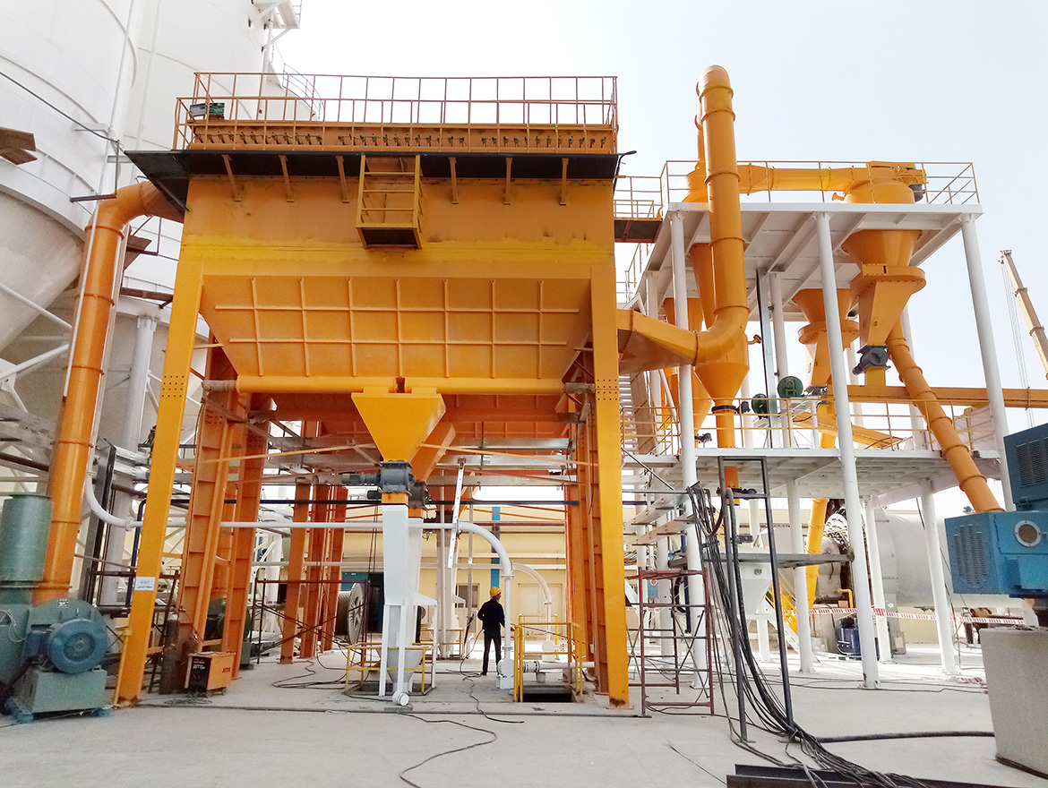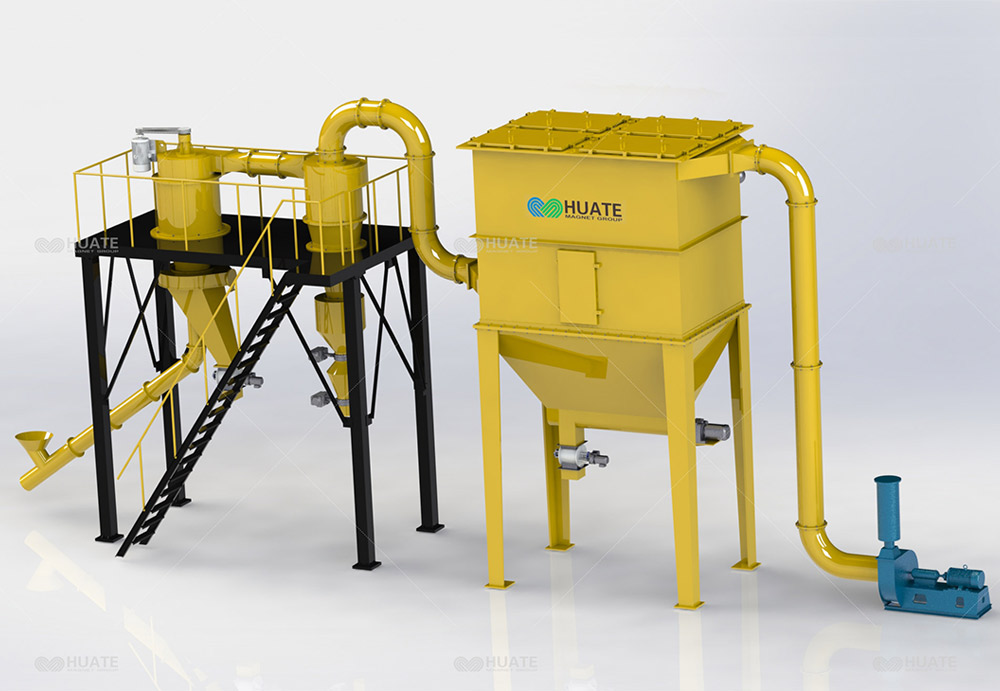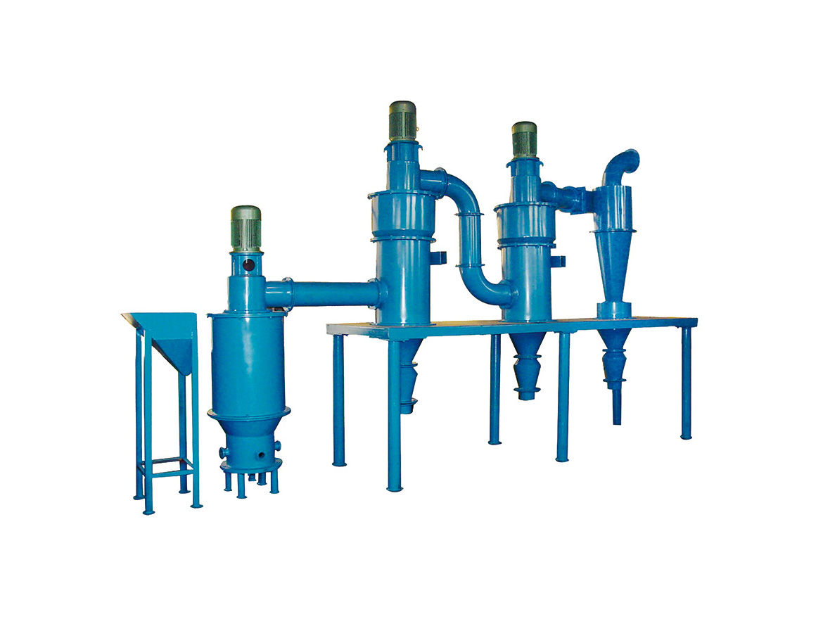 整套分級(jí)裝置由氣流分級(jí)機(jī)、旋風(fēng)收集器、脈沖除塵器、高壓引風(fēng)機(jī)、電控柜等組成。氣流分級(jí)機(jī)是帶有二次進(jìn)風(fēng)及立式安裝的大葉輪轉(zhuǎn)子的強(qiáng)制型分級(jí)機(jī)。工作時(shí)物料在引風(fēng)機(jī)引力的作用下由下筒身進(jìn)入,外界一次風(fēng)與物料充分混合,使粒子得以充分分散,并上升至分級(jí)區(qū),由于分級(jí)葉輪轉(zhuǎn)子的高速旋轉(zhuǎn),粒子即受到分級(jí)葉輪旋轉(zhuǎn)產(chǎn)生的離心力,又受到引風(fēng)機(jī)引力產(chǎn)生的向心力,當(dāng)粒子受到的離心力大于向心力,分級(jí)徑以上的粗粒子被甩到筒體內(nèi)壁失速沿壁面下滑,外界二次風(fēng)通過均勻分布在錐體上的進(jìn)風(fēng)口進(jìn)入,對(duì)粗粒子進(jìn)行產(chǎn)生風(fēng)篩作用將混雜或粘附于粗料中的細(xì)粉分離干凈,分離后的粗料由卸料裝置收集排出分級(jí)機(jī),分級(jí)徑以下的細(xì)粉隨氣固二相流進(jìn)入旋風(fēng)收集器、脈沖除塵器收集下來,凈化后的氣體由引風(fēng)機(jī)排出。